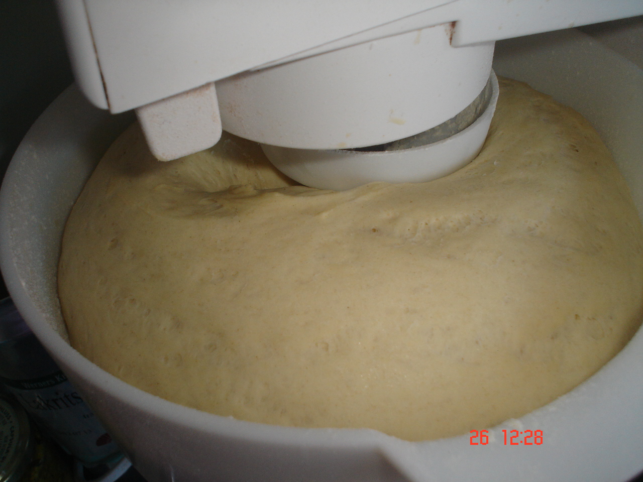 Tilsett melkeblandingen i bollen hvor gjæren allerede ligger. Tilsett egget.